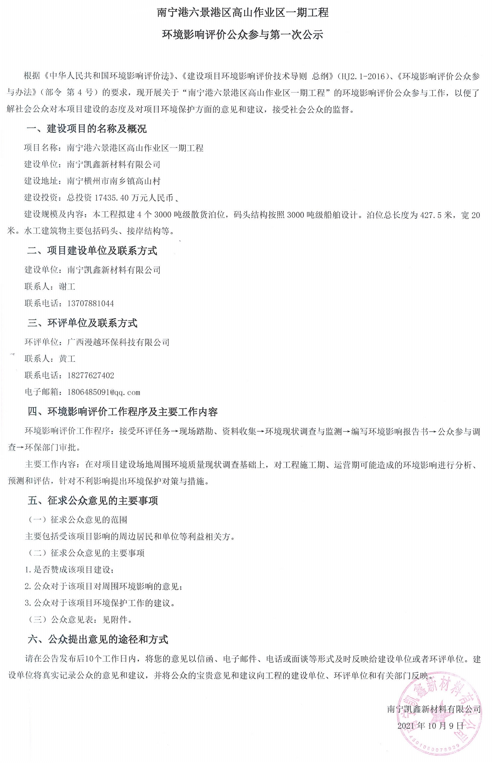 南寧港六景港區(qū)高山作業(yè)區(qū)一期工程環(huán)境影響評價公眾參與第一次公示