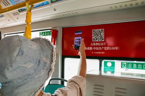 車廂內(nèi)利用前、后門的擋板展示重溫“紅船精神”“井岡山精神”。另外,通過(guò)聯(lián)合南寧云—南寧新聞網(wǎng)利用融媒技術(shù),設(shè)置了“南寧津頭走出的傳奇故事”“我的入黨故事”等紅色主題宣傳板塊,乘客們通過(guò)微信掃描車廂內(nèi)二維碼,可以觀看100部黨史紀(jì)錄故事,可以了解革命先烈雷經(jīng)天的傳奇故事,聆聽(tīng)南寧市各行業(yè)100名優(yōu)秀黨員的入黨故事,還可以登錄黨史學(xué)習(xí)教育官網(wǎng)關(guān)注黨史教育,進(jìn)行電子閱讀。車廂頂部“感恩黨,跟黨走”的醒目大字,更是讓乘客一上車就感受到濃厚的黨史學(xué)習(xí)氛圍。