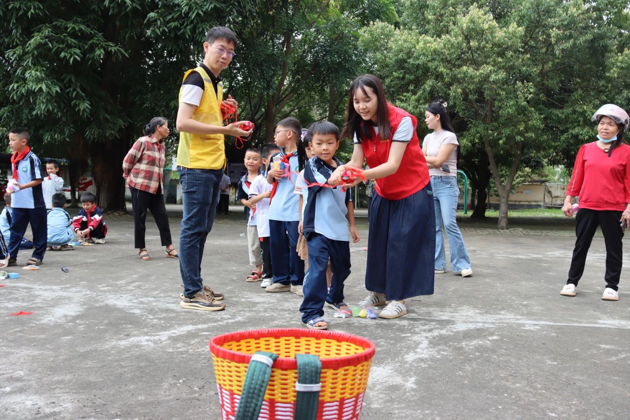 課堂結(jié)束后,在志愿者們的帶領(lǐng)下,孩子們來到教室外參與拋繡球、投壺、套圈等民族傳統(tǒng)體育項(xiàng)目。志愿者與孩子們分組協(xié)作、相互配合,完成了一項(xiàng)項(xiàng)挑戰(zhàn),激勵(lì)孩子們享受運(yùn)動(dòng)的快樂,觀察到、感受到生活中的民族藝術(shù)的魅力,豐富了文化生活和情感體驗(yàn)。